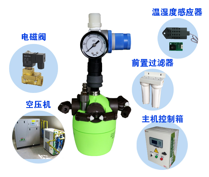 利用空壓機氣體將水霧化,水霧顆粒細、揮發(fā)快、效率高。